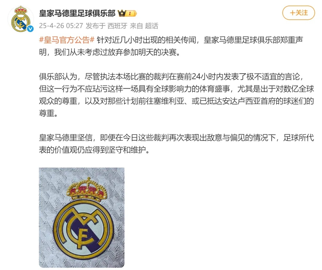 俱乐部认为,尽管执法本场比赛的裁判在赛前24小时内发表了极不适宜的言论,但这一行为不应玷污这样一场具有全球影响力的体育盛事,尤其是出于对数亿全球观众的尊重,以及对那些计划前往塞维利亚、或已抵达安达卢西亚首府的球迷们的尊重。