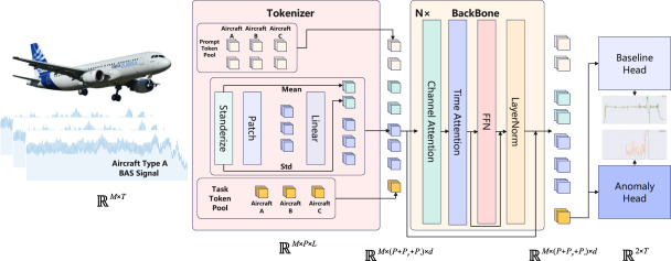 相较于传统方法多依赖单一机型、模型容量有限且泛化性差,该研究提出一种 “预测下一个信号 token” 的自监督预训练方法,联合利用三类机型的飞行数据开展训练,成功学习到通用的信号健康表征。在此基础上,设计了高度适配工程场景的联合损失函数,显著提升了模型在下游异常检测和基线预测任务中的表现。研究进一步验证了,基于时序大模型的飞参建模方式能够有效打破机型壁垒,实现诊断知识在多型号间的共享与迁移。相关论文已被国际工程信息学领域的一区 Top 期刊《Advanced Engineering Informatics》接收发表。