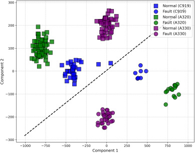 可视化分析进一步验证了模型的表示能力。通过 t-SNE 将不同机型的信号语义映射至二维空间,结果显示模型能够清晰划分正常与异常状态,即使传感器配置存在差异,仍具备良好的判别能力。