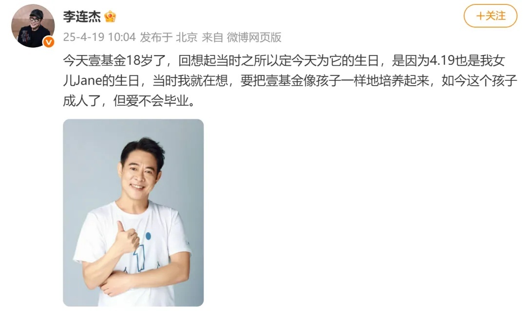 此前,4月19日,李连杰曾在微博发文称:今天壹基金18岁了,回想起当时之所以定今天为它的生日,是因为4.19也是我女儿Jane的生日,当时我就在想,要把壹基金像孩子一样地培养起来,如今这个孩子成人了,但爱不会毕业。