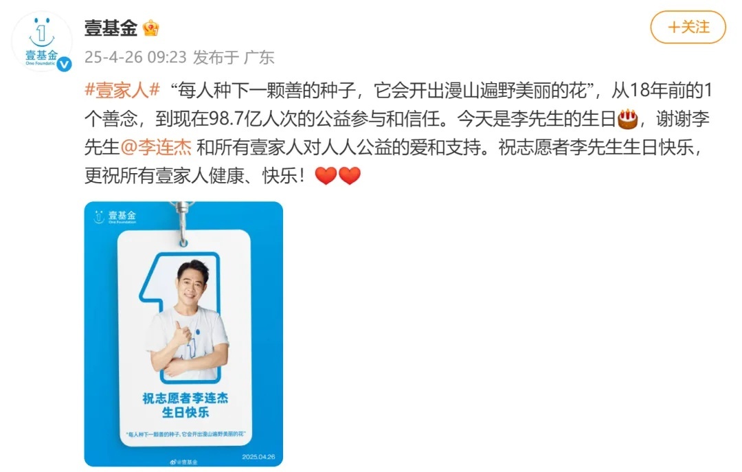 当天,“壹基金”也在其官方微博发文:“每人种下一颗善的种子,它会开出漫山遍野美丽的花”,从18年前的1个善念,到现在98.7亿人次的公益参与和信任。今天是李先生的生日,谢谢李先生和所有壹家人对人人公益的爱和支持。祝志愿者李先生生日快乐,更祝所有壹家人健康、快乐!