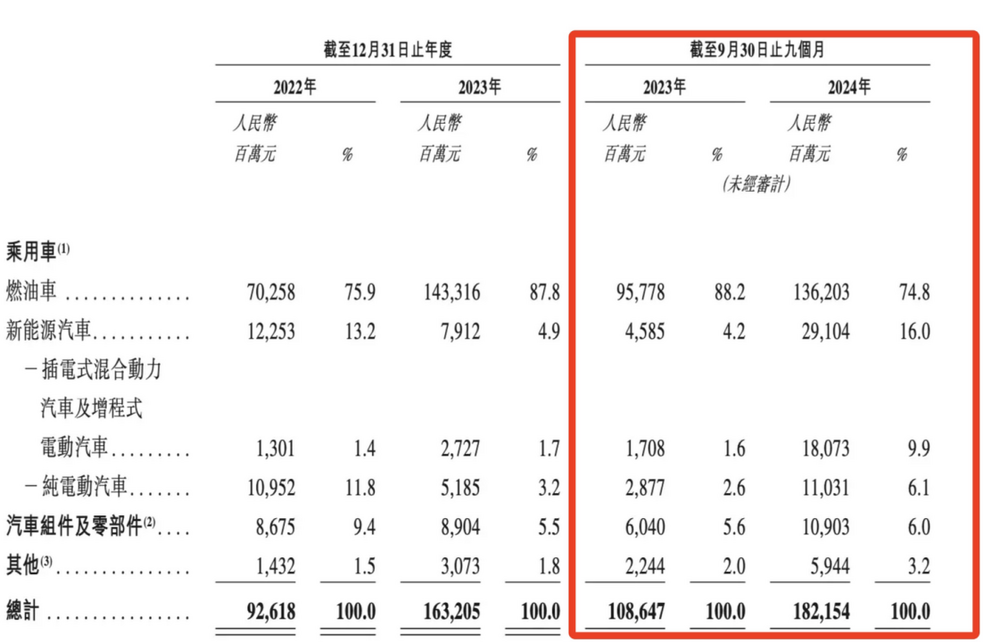 从奇瑞汽车的招股书中能够发现,2024年前9个月,来自于新能源汽车的收入占到总收入的16%,虽然看起来并不算高,但上一年同期占比只有4.2%,而燃油车的收入占比则从2023年前9个月的88.2%,降低到了2024年前9个月的74.8%。