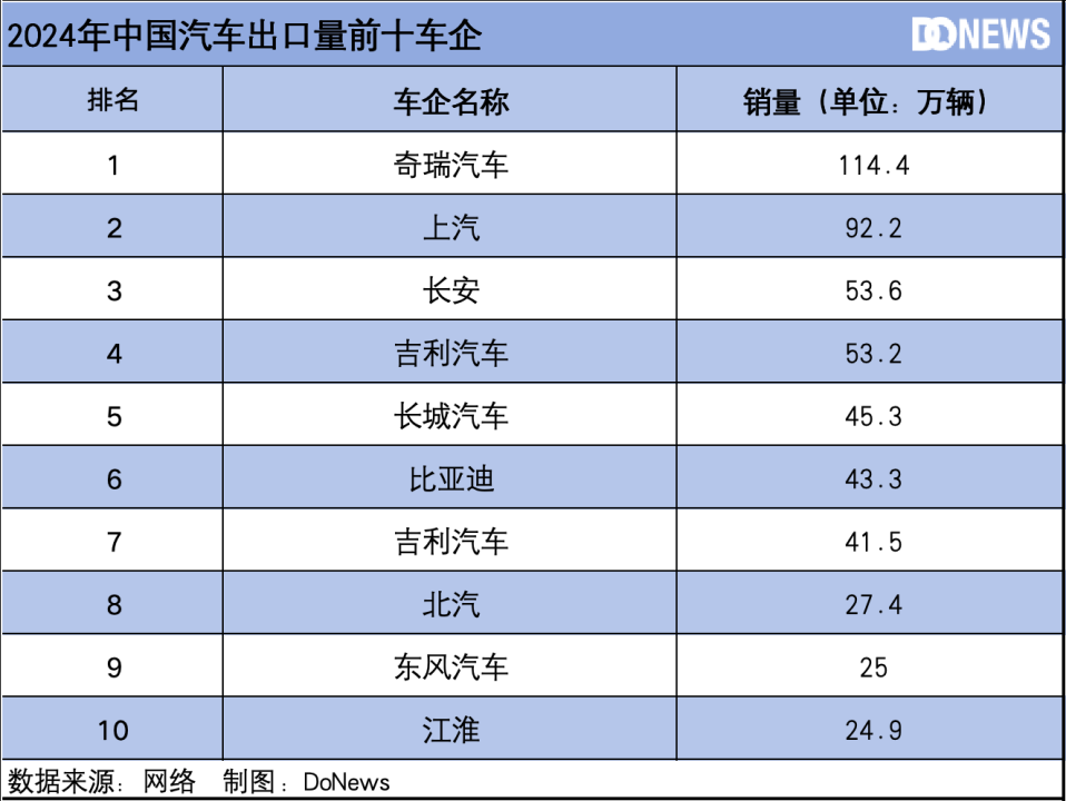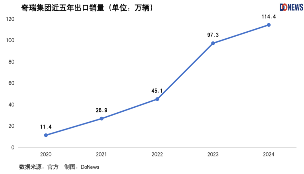 近5年间,中国汽车出口呈现飞速增长的趋势,2023年中国首次登顶全球汽车出口榜首。中国汽车工业协会数据显示,2024年中国汽车出口量达到585.9万辆,同比增长19.3%。在中国汽车出海的浪潮中,奇瑞无疑是佼佼者,从2020年的11.4万辆到2024年的114.4万辆,5年间实现了10倍增长。