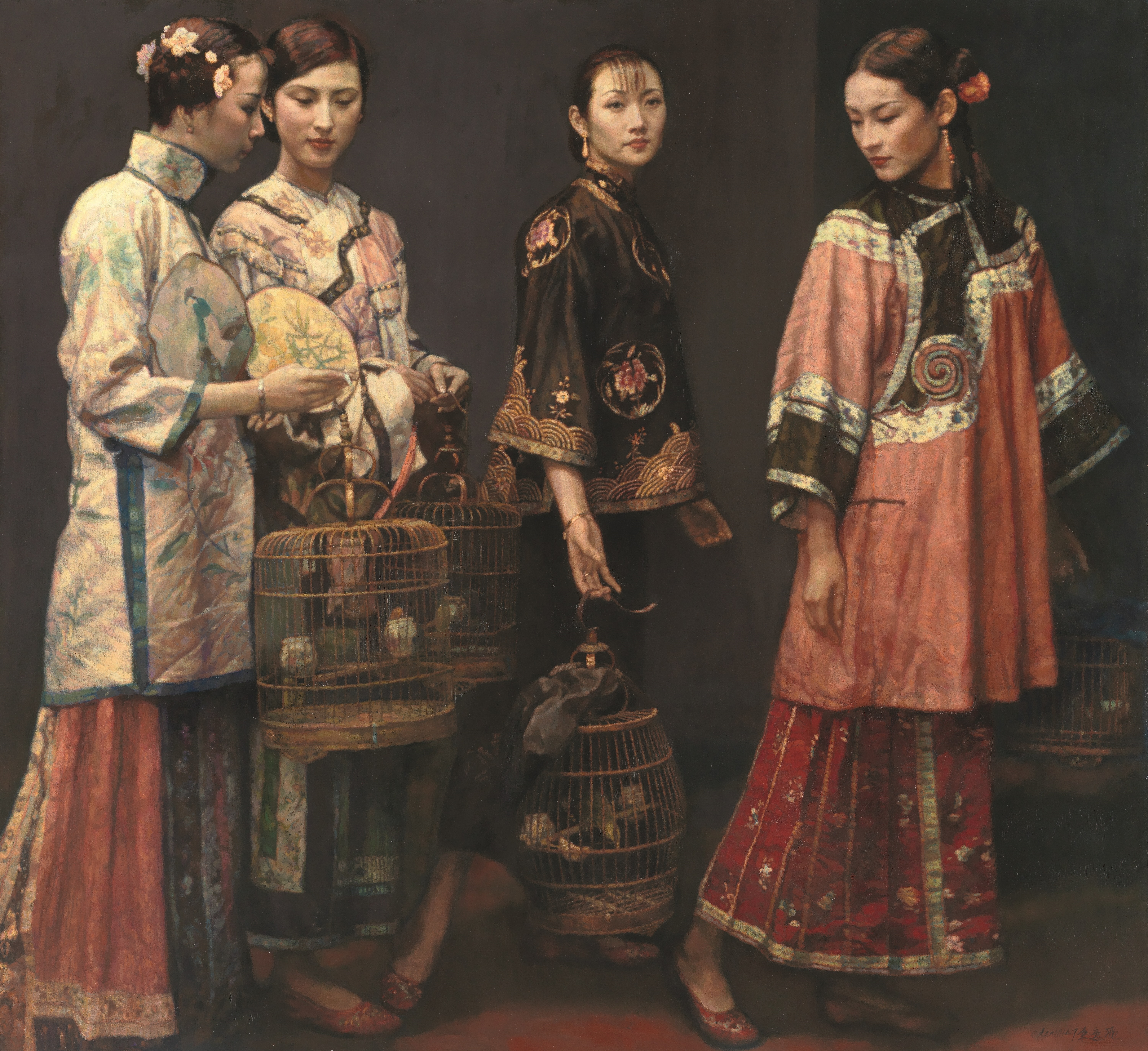 两年后完成的《玉堂春暖》是他以民国时期老上海为背景构思的一幅时代画卷。这件作品在美学和技法上近乎完美,成为这一时期的又一巅峯之作。值得一提的是,2023年,由著名导演王家衞执导的大热影视作品《繁花》使陈逸飞再度走入大众的视野。该剧设定于20世纪90年代的上海,恰好与陈逸飞发展海派绘画的时期相重合。剧中,艺术家笔下的《玉堂春暖》和《仕女与鸟笼》作为背景亮相于至真园内。通过本次展览,观众们可以近距离欣赏到这两幅作品的真迹。