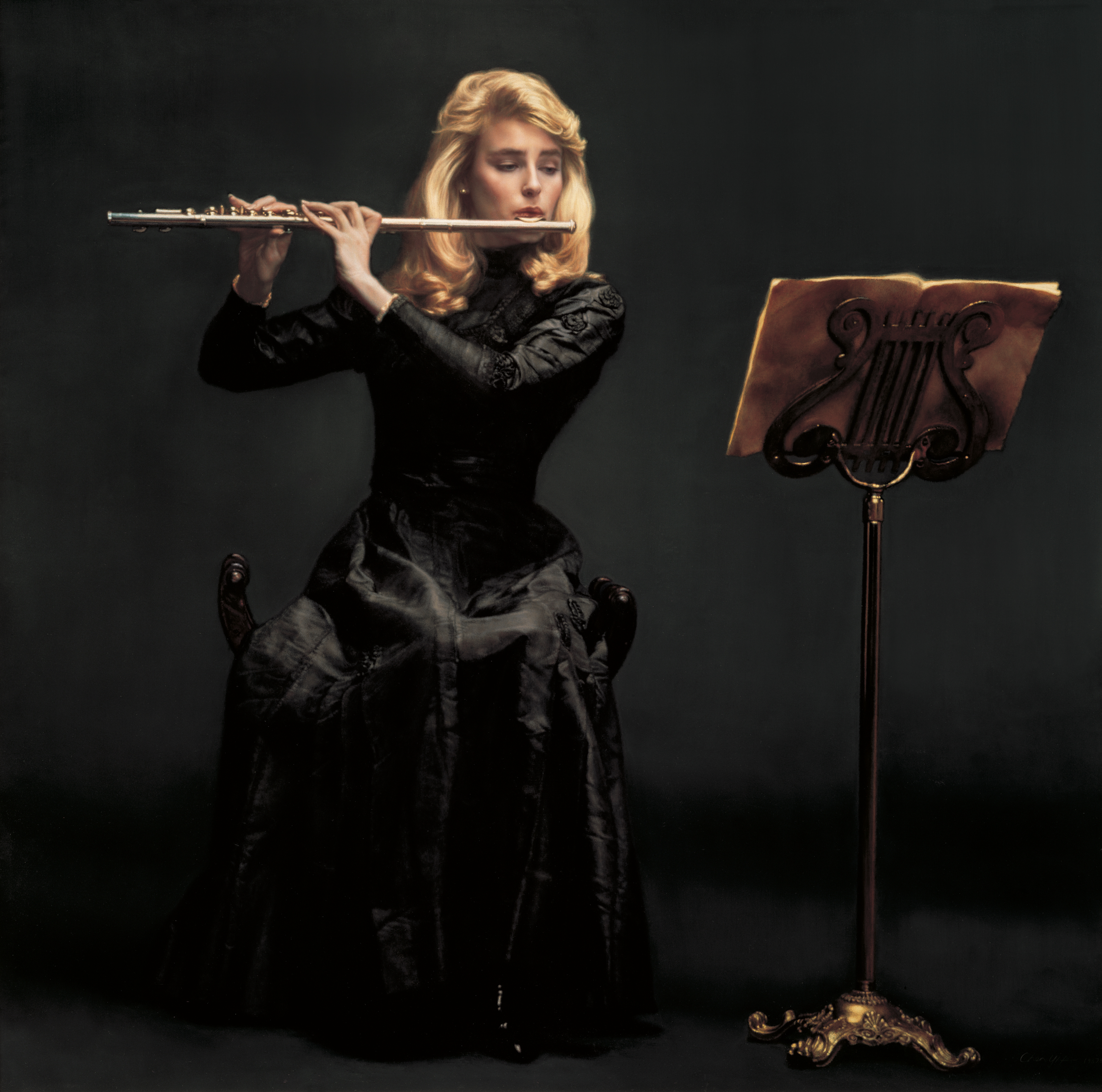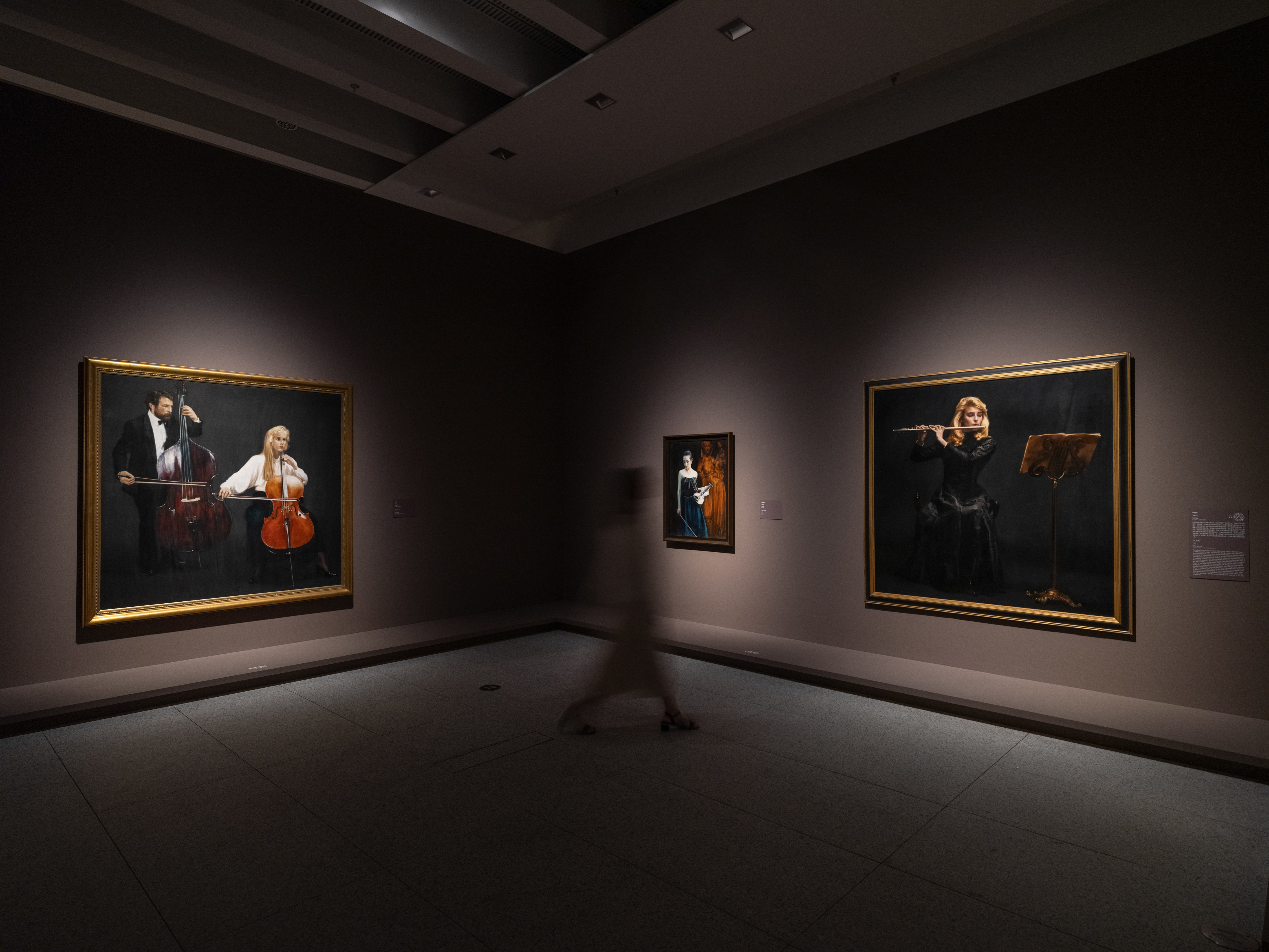 「音乐家」系列则从宏大敍事转向对个体精神世界的凝视。《长笛手》等作品以大面积的深色为背景,人物形象高贵而优雅,在简约中展现深邃。陈逸飞从摄影中获得启发,大胆地革新了对边缘线与面部轮廓的处理方式。他对光影的运用精湛,在古典的基础上兼具了当代艺术流派照相写实主义的特点。