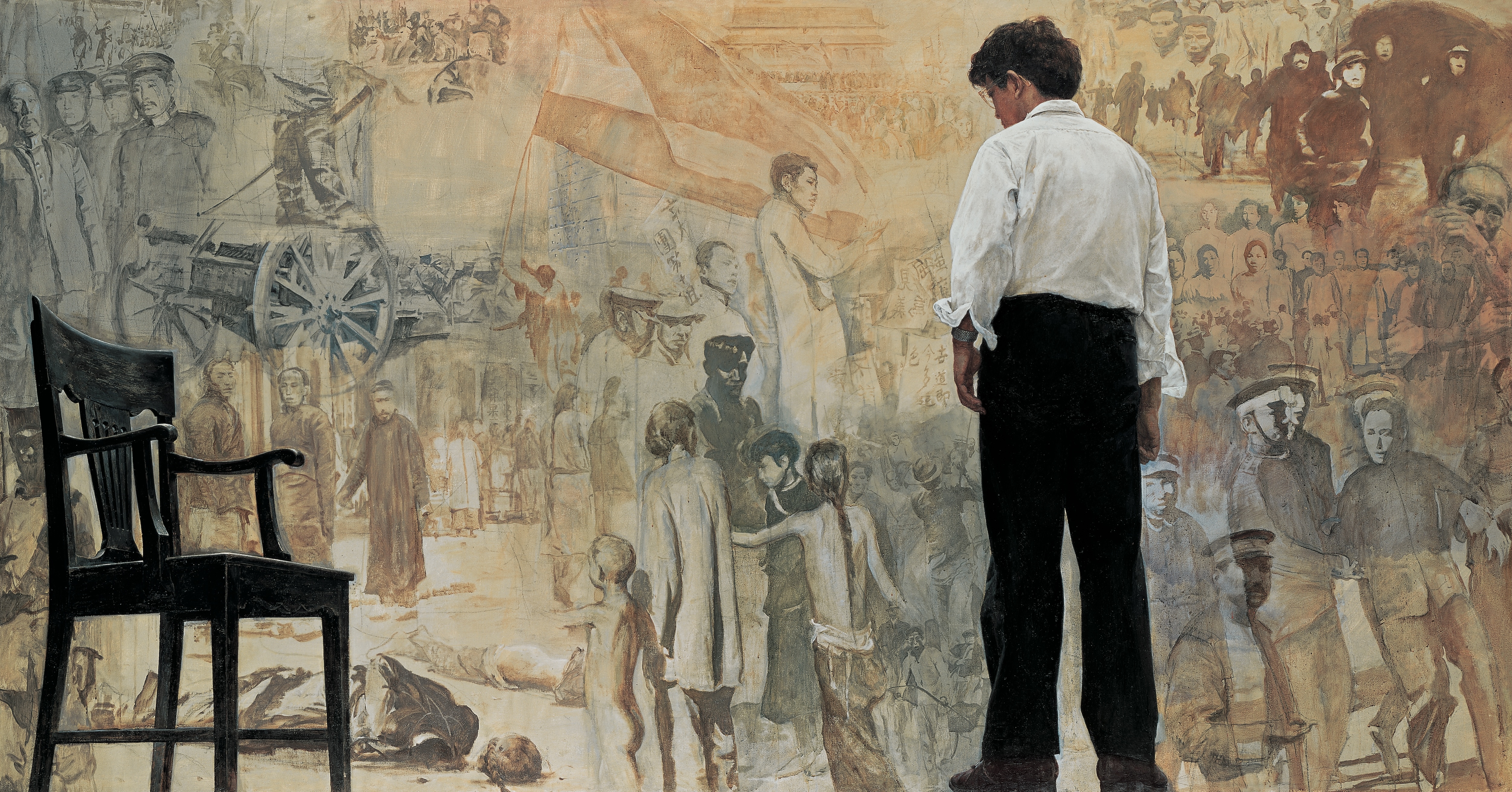 1979年,陈逸飞创作了杰作《踱步》。他以史诗般的画面重构了中华民族近代历史的重要瞬间,通过创造性地折叠线性时间,实现了技法与思想的双重突破。《踱步》的诞生,标志著陈逸飞对自我的超越和其历史观的成熟。这幅作品更获得了广泛的国际关注,成为中国新时期美术走向国际化的起点与标志。
