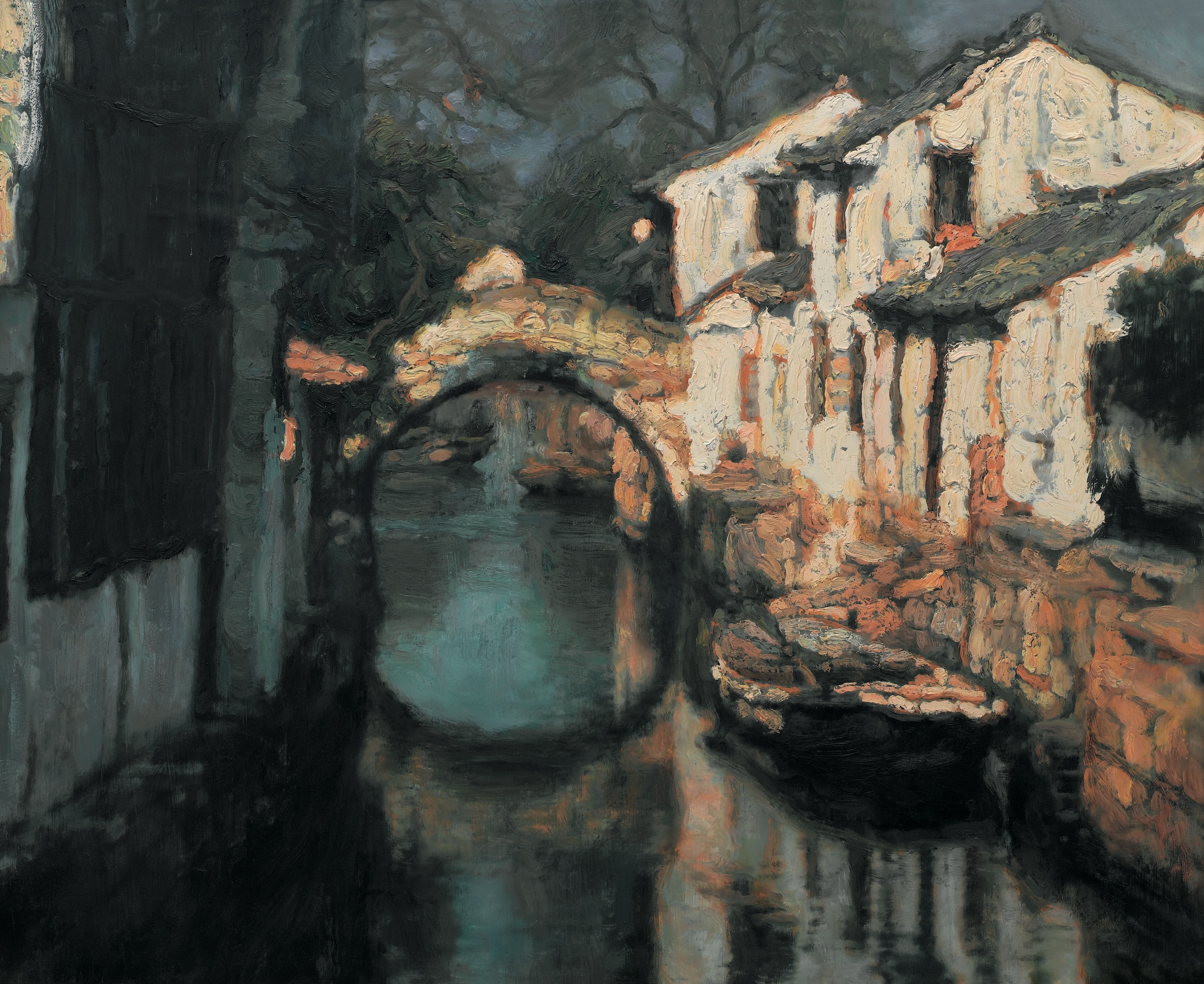 「水乡」系列的诞生始于陈逸飞对江苏古镇周庄的一次实地采风。获得主题选择自由后,陈逸飞回归内心深处的牵挂——故乡。江南水乡、童年嬉戏的石桥、烟雨朦胧的瓦屋成为其创作源泉。1983年,他以水乡为主题的系列作品在美国哈默画廊个展中大获成功,凭借独特的东方之美,成为首位在西方主流艺术市场引发关注与收藏热潮的中国当代画家。此时,陈逸飞已成功探索出一条融合中国美学与西方写实技巧的道路。