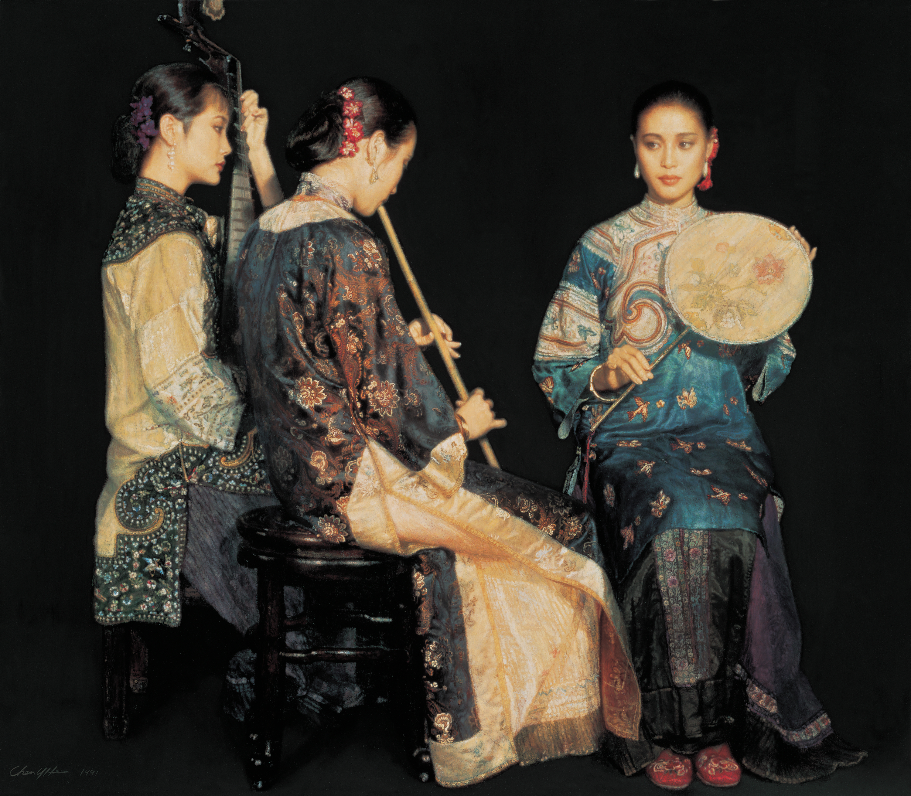「仕女」系列中,他以独特的视角重新追忆并想象海派文化。本板块中,创作于1991年的音乐主题人物羣像《夜宴》拉开了该系列创作高峯时期的序幕。这幅作品的艺术构思和画面布局与中国古代画家顾闳中的《韩熙载夜宴图》中五位吹笛女子的场景遥相呼应,展现了陈逸飞对中国古典艺术的深刻理解。