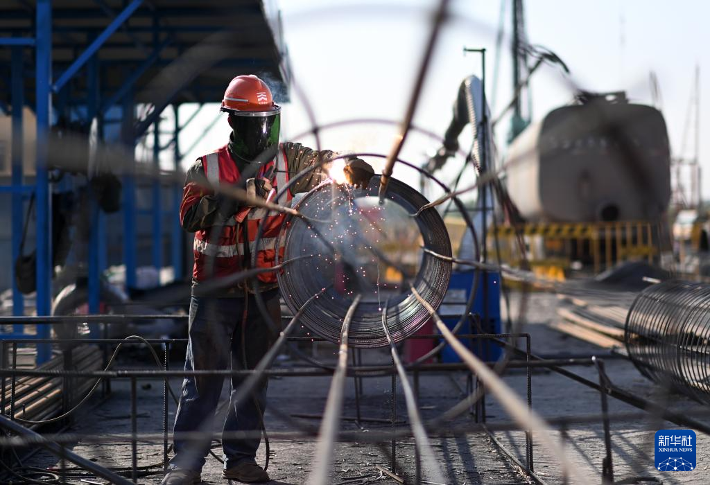 4月25日,工人在天津港环球滚装码头汽车物流堆场工程建设现场施工。