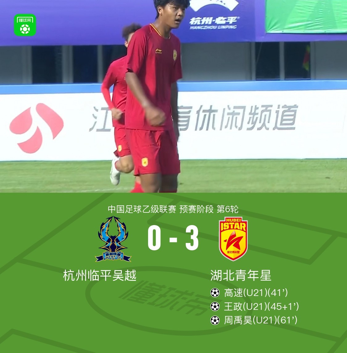 北京时间4月26日,中国足球乙级联赛预赛阶段第6轮,杭州临平吴越主场迎战湖北青年星。比赛中,湖北青年星凭借高速的进球取得领先,随后高速助攻王政扩大比分,接着周禹昊再入一球锁定胜局。最终,杭州临平吴越0-3不敌湖北青年星。