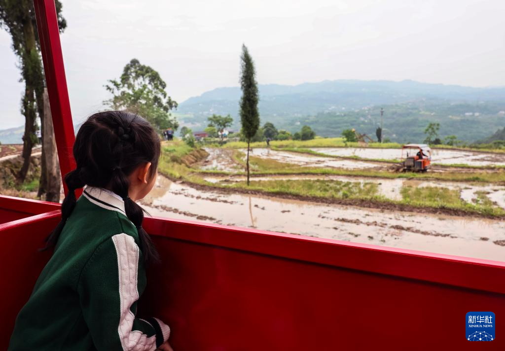4月25日,小朋友在重庆市綦江区古南街道花坝村体验观光小火车项目。