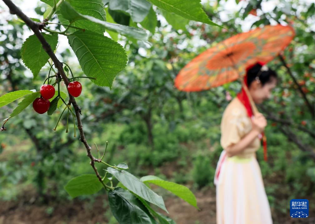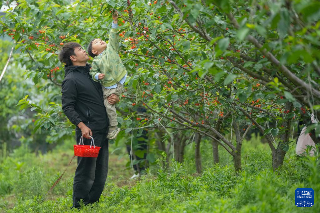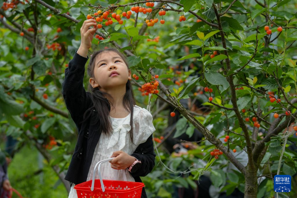 4月25日,在重庆市綦江区古南街道花坝村,一名游客在樱桃园内感受采摘带来的乐趣。
