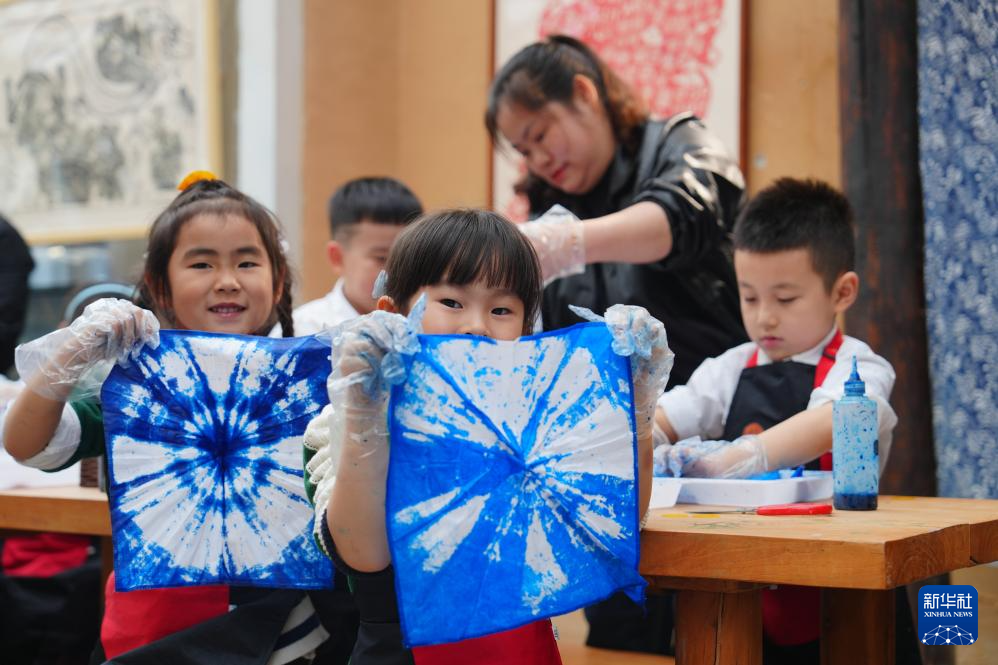 4月25日,在重庆市綦江区古南街道花坝村,小朋友在展示自己的蜡染作品。