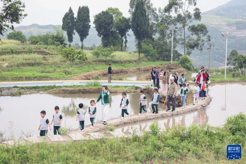 4月25日,在重庆市綦江区古南街道花坝村,游客行走在田坎上。
