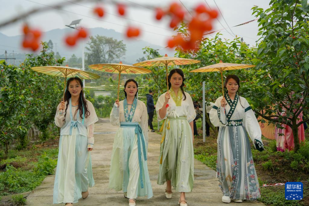 4月25日,身着传统服饰的游客在重庆市綦江区古南街道花坝村樱桃园内游玩。