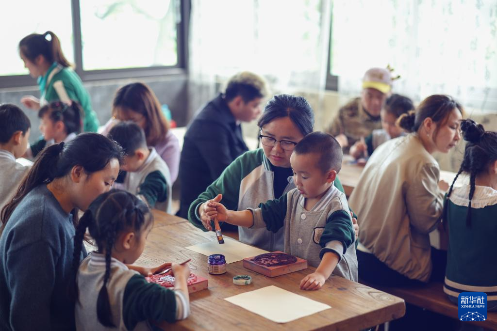 4月25日,小朋友们在重庆市綦江区古南街道花坝村体验版画拓印。