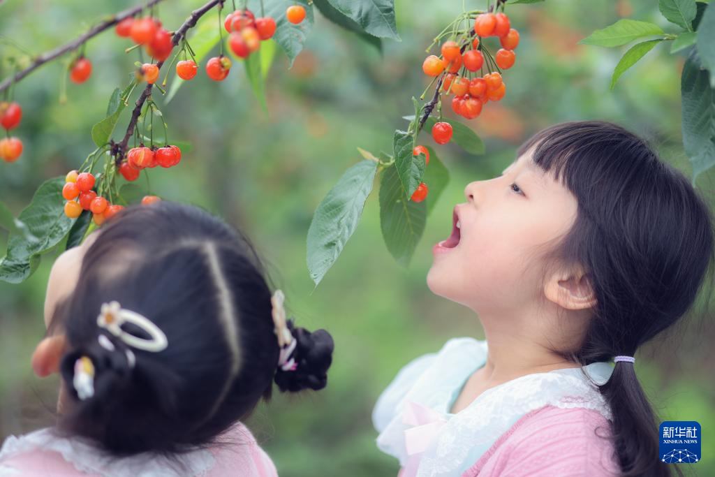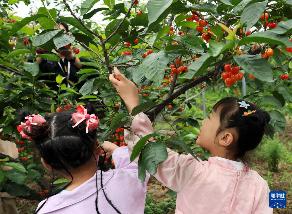 4月25日,在重庆市綦江区古南街道花坝村,两名小朋友在樱桃园内感受采摘樱桃的乐趣。