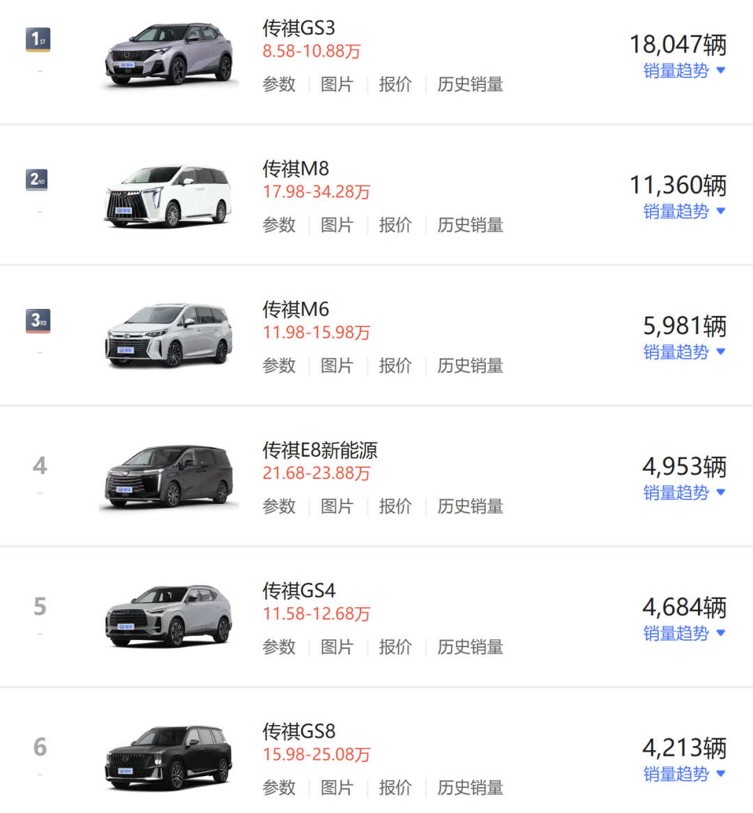 零售数据显示,今年一季度,广汽传祺累计销量为55982辆,其中,销量最高的是传祺GS3,为18047辆;传祺M8紧随其后,为11360辆,其余车型表现均一般,其中,传祺M6、传祺E8新能源、传祺GS4、传祺GS8累计销量分别为5981辆、4953辆、4684辆和4213辆,而向往S7自上市以来累计销量为1936辆。