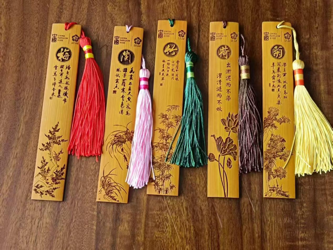 “别小看这枚书签,它可是咱铜鼓竹林的‘外交使节’!”卓越木业董事长周晨航笑着展示手中的竹书签,竹面上“梅”“兰”“竹”“荷”“菊”图案与世博logo巧妙融合,“你摸这纹理,像不像咱山林的竹子?我们把铜鼓的花木、竹海都‘编’进了书签里。”