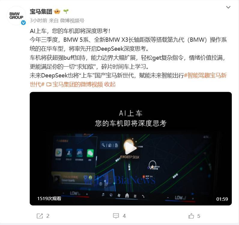 4月27日,宝马集团官方微博宣布,今年三季度,BMW 5系、全新BMW X3长轴距版等搭载第九代(BMW)操作系统的在华车型,将率先开启DeepSeek深度思考。