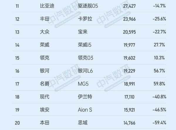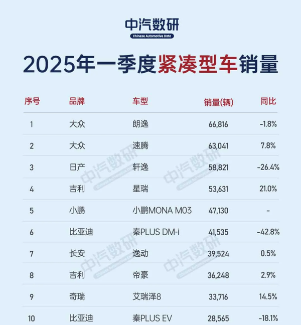 【CNMO科技消息】乘联会数据显示,2025年一季度,中国轿车市场整体销量实现了8.3%的同比增长,但紧凑型轿车市场却出现了下滑,零售销量为87.2万辆,同比下降11.1%。而近日,CNMO注意到,中汽数研公布了2025年第一季度紧凑型车销量排行榜: