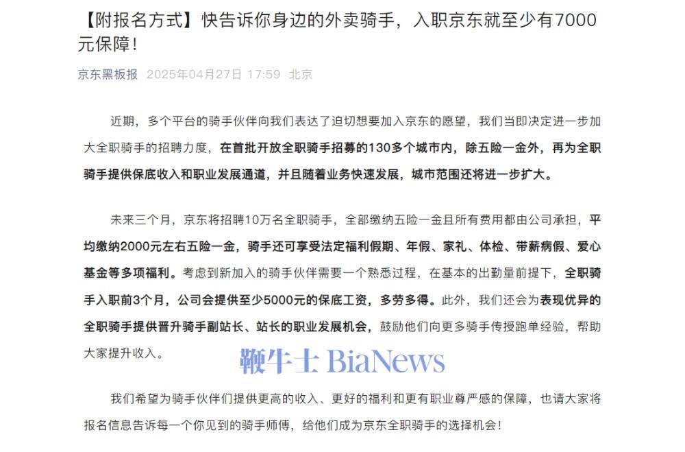 4月27日,京东黑板报发文称,入职京东就至少有7000元保障。