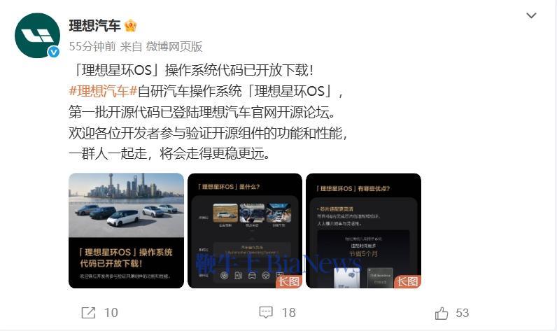 4月27日,理想汽车宣布,「理想星环OS」操作系统代码已开放下载,第一批开源代码已登陆理想汽车官网开源论坛。