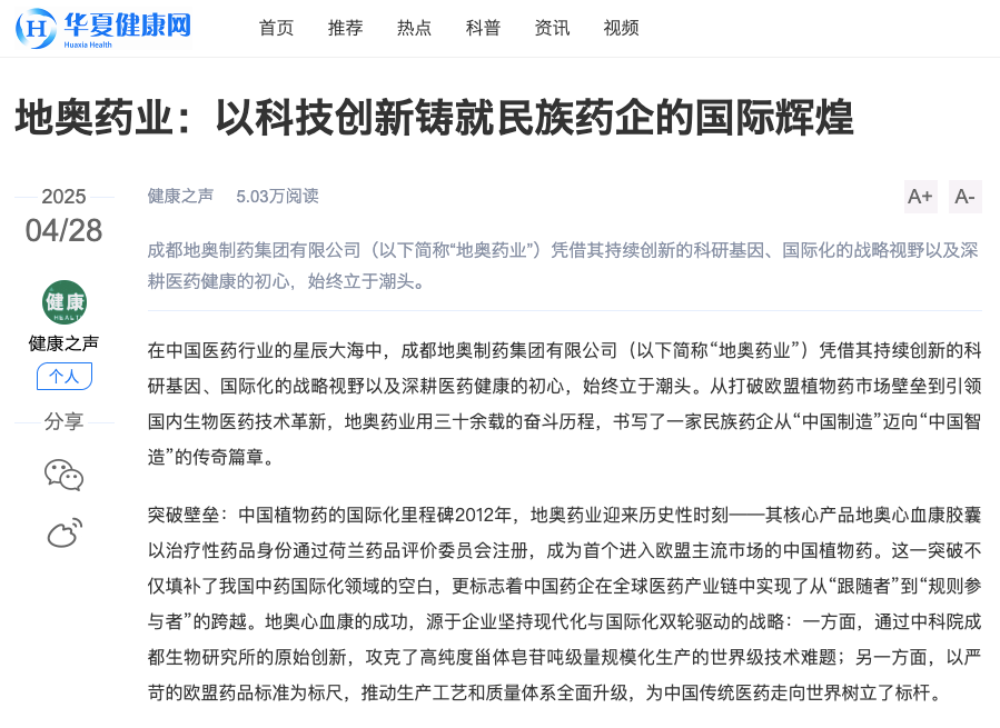 在中国医药行业的星辰大海中,成都地奥制药集团有限公司(以下简称“地奥药业”)凭借其持续创新的科研基因、国际化的战略视野以及深耕医药健康的初心,始终立于潮头。从打破欧盟植物药市场壁垒到引领国内生物医药技术革新,地奥药业用三十余载的奋斗历程,书写了一家民族药企从“中国制造”迈向“中国智造”的传奇篇章。