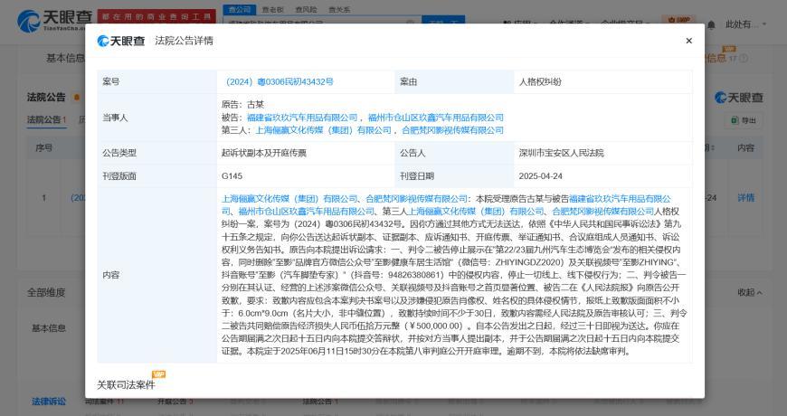天眼查司法案件显示,近日,深圳市宝安区人民法院向上海俪赢文化传媒(集团)有限公司、合肥梵冈影视传媒有限公司公告送达古天乐与福建省玖玖汽车用品有限公司、福州市仓山区玖鑫汽车用品有限公司人格权纠纷案件证据副本、应诉通知书、开庭传票等,原告古天乐请求判令二被告停止展示在“第22/23届九州汽车生态博览会”发布的相关侵权内容,同时删除“至影”品牌官方微信公众号、抖音账号等的侵权内容并公开致歉,此外,原告请求判令二被告共同赔偿原告经济损失50万元。自本公告发出之日起,经过三十日即视为送达,定于2025年6月11日公开开庭审理。