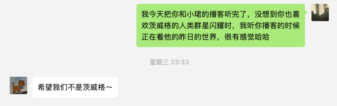 我在听肖弘播客时候,正在看茨威格的昨日的世界,没想到他突然也提到了茨威格并推荐人类群星闪耀时,我给肖弘发消息说这个事情,他回复,希望我们都不是茨威格。