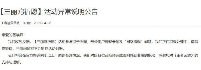 随后,王者运营团队发布《活动异常说明公告》,当前活动参与过于火爆,部分用户偶现卡顿及“网络错误”问题,但当前问题将不会影响活动数据。