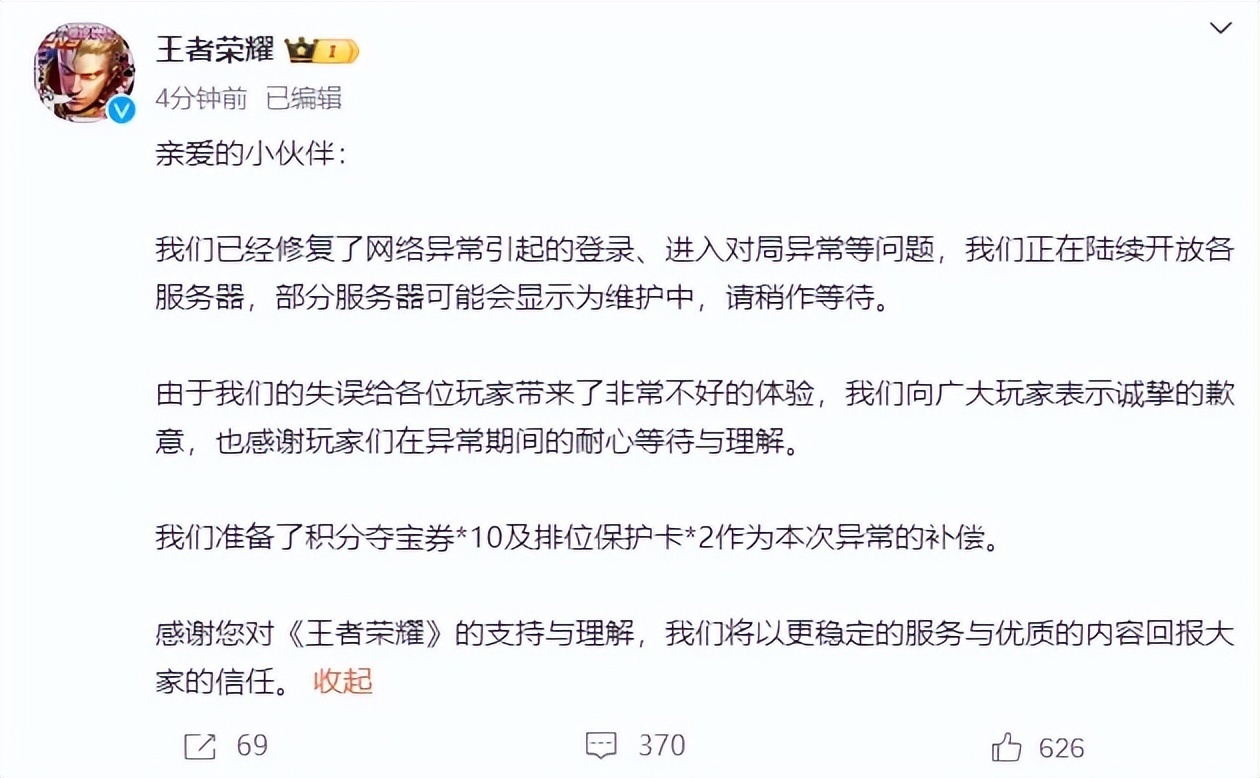 29日凌晨,王者荣耀官方再发声明,称已修复问题,并公布补偿方案:我们已经修复了网络异常引起的登录、进入对局异常等问题,我们正在陆续开放各服务器,部分服务器可能会显示为维护中,请稍作等待。