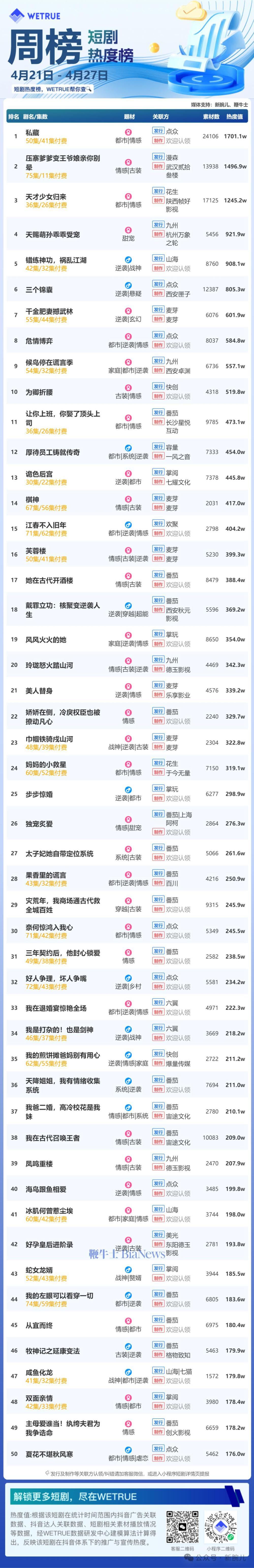 4月28日,新腕儿、鞭牛士联合WETRUE一点查剧共同推出4月第4周短剧热度周榜、短剧星图达人热度榜、端原生短剧榜和品牌短剧周榜。
