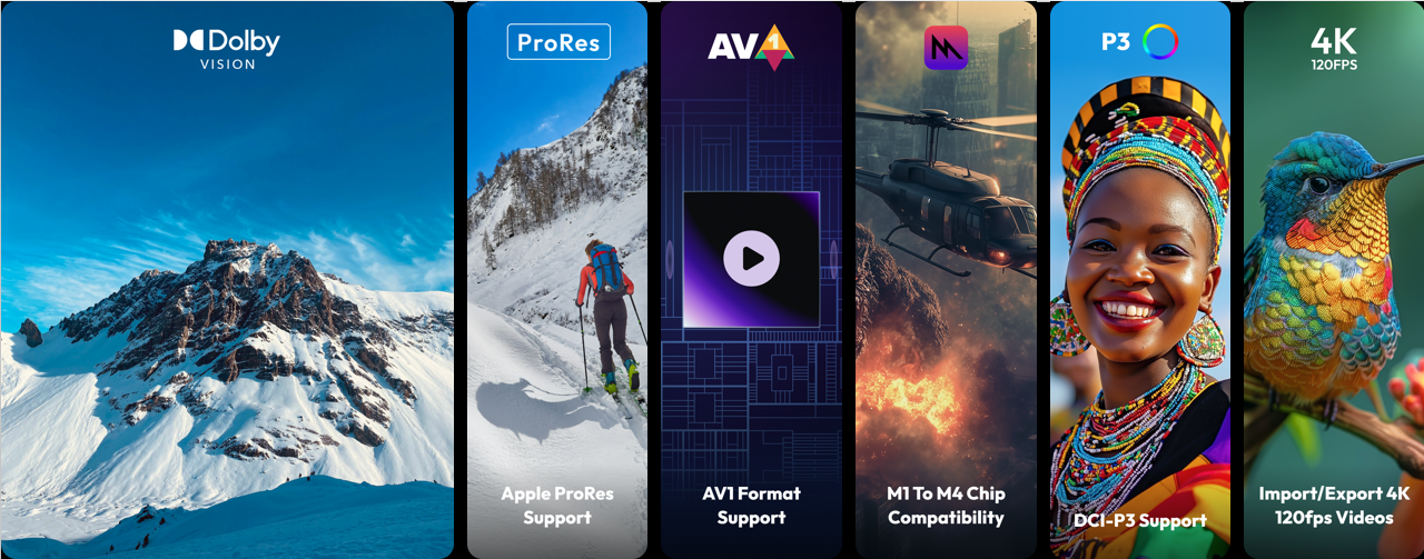 除以上功能外,Wondershare Filmora及万兴喵影还全新支持AV1格式,其高编码效率和节省带宽的优势,使视频在保持高画质的同时,文件体积更小,传输更高效;Metal渲染技术显著提升了视频编辑的性能和流畅度,为用户提供更强大的创作体验;P3色域支持则可确保视频在苹果设备上获得最佳的色彩呈现,让视频质量更上一层。