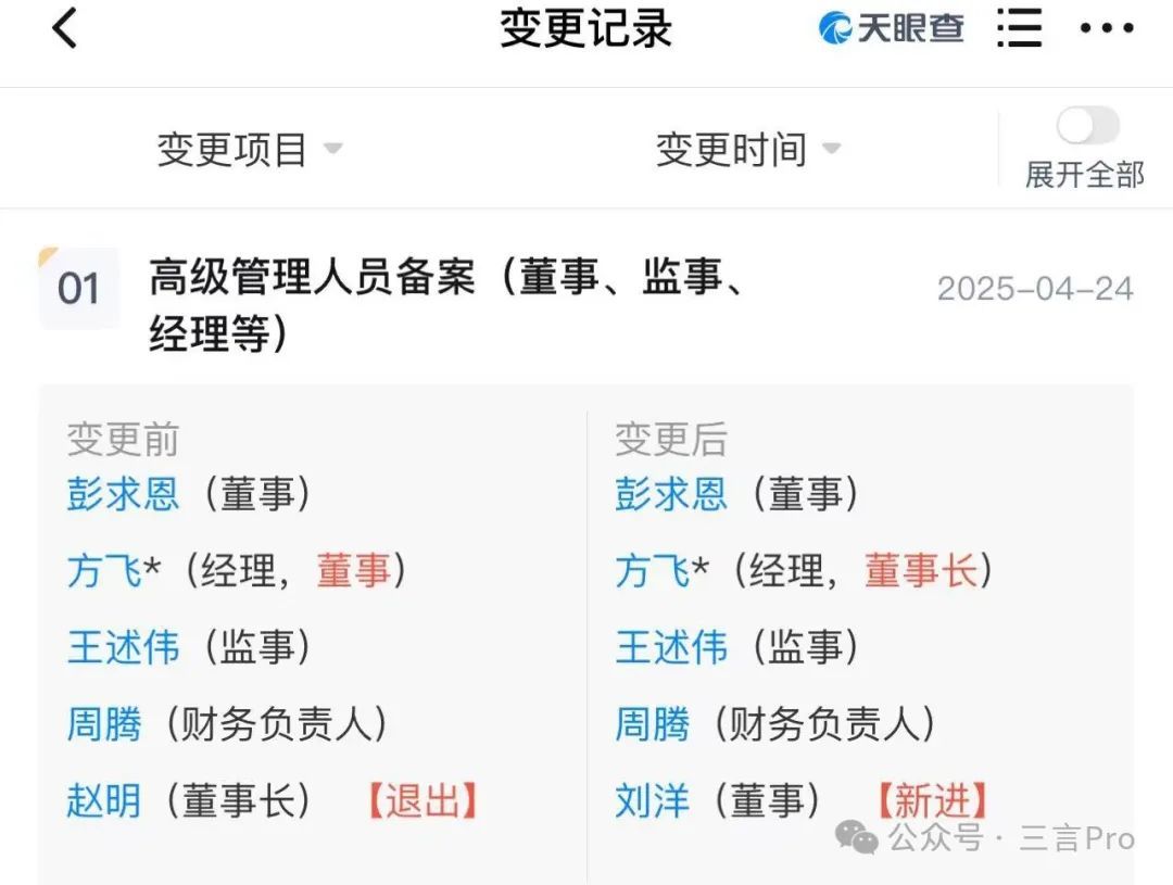 其中,北京公司由方飞接任董事长职务,西安公司由刘洋接任。