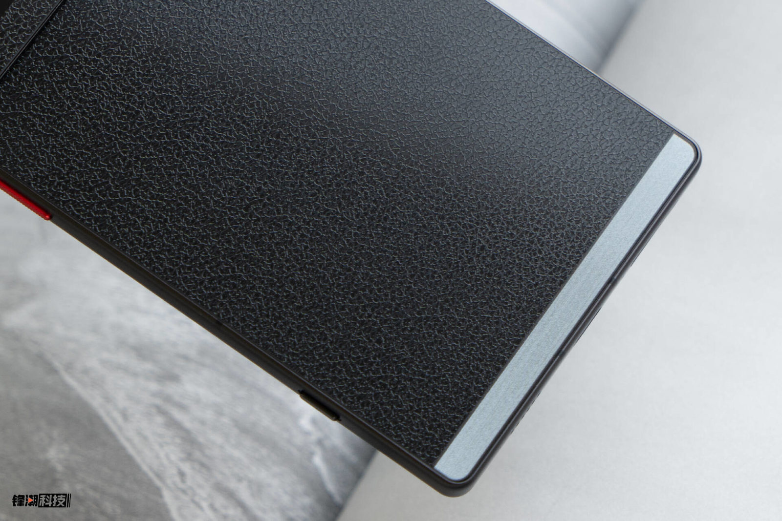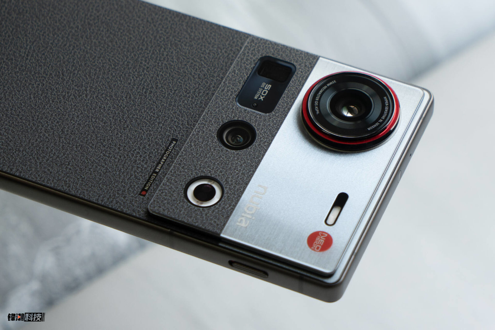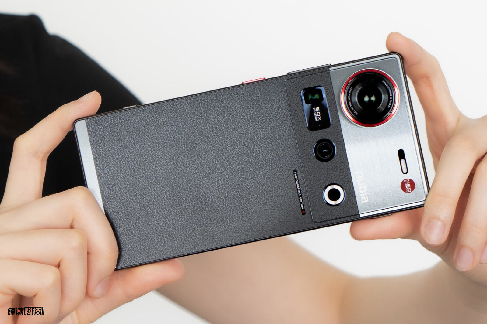 除了后盖的部分,它在机身上半部分的模组上也采用了这种皮纹设计,与后盖的皮纹部分平齐,看起来视觉更统一,最上面的部分又回归了类似金属拉丝的观感,也就是这款摄影师版本主打的独特“相机感”。