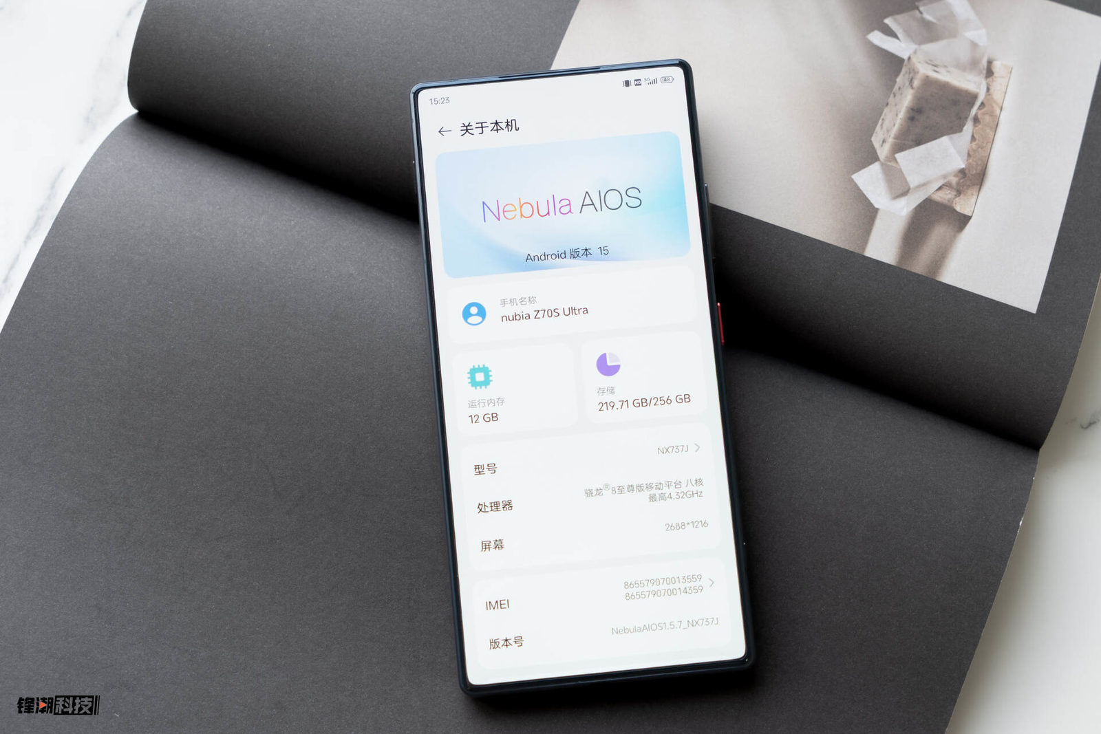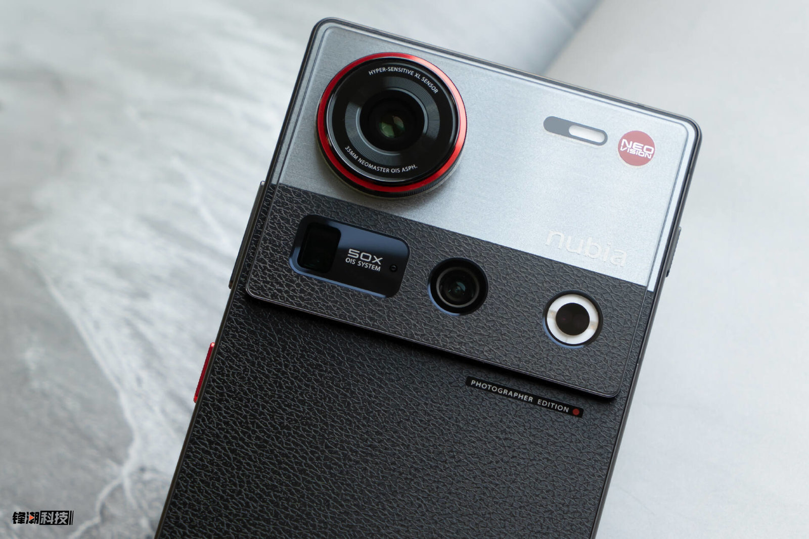 影像模组的布局倒是没有什么变化,还是大家熟悉的红圈主摄,其上还有直纹滚花,仿佛真的是一枚可以手动调整的相机镜头;下方则还是平放的潜望式长焦与超广角镜头,与环状闪光灯排成一行。这样的一个模组几乎覆盖了三分之一的后盖面积,在“奥利奥”模组当道的今天,还是比较有辨识度的。