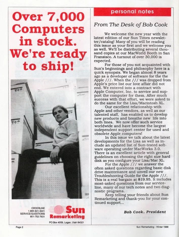 1970 年代末,Bob Cook 正在犹他州立大学读书,一次偶然的机会,他在电脑杂志上看到一则广告「成为 Apple 经销商只需填写表格并寄回」,Cook 就这样成为了 Apple II 的经销商之一。但商业的起步并不轻松,他必须先购入六台 Apple II 电脑才能开始销售,这些设备尚属前沿科技,价格高昂且不稳定,他花了九个月时间才卖完这六台电脑。