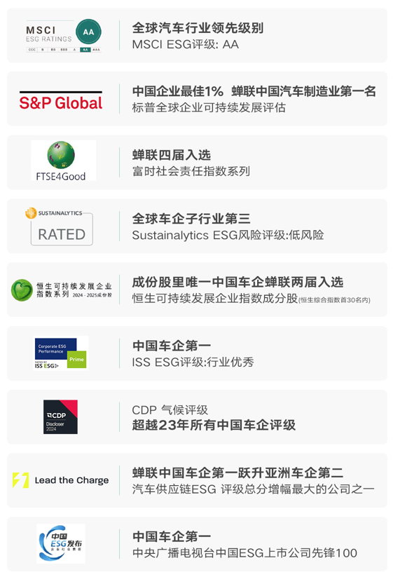 凭借ESG管理工作的推进落地、全面详尽的ESG信息和战略披露、和利益相关方的充分交流探讨,吉利汽车2024年ESG相关工作赢得外界的广泛赞誉和权威认可,包括连续三年荣获《财经》双碳领导力“卓越”评级,连续两年位居“中国ESG上市公司先锋100”榜单第八、蝉联中国车企第一名,还获得国际最具权威性的MSCI ESG评级AA级,且连续两年入选恒生可持续发展企业指数,ISS ESG评级行业优秀、中国车企第一等荣誉,充分印证了吉利汽车的中国车企ESG标杆地位。