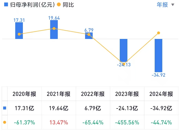 其业绩连续3年下滑,2023年和2024年合计亏掉59亿元。