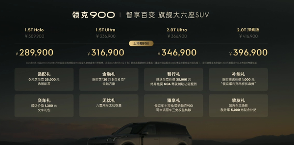 4月28日晚,领克900正式上市,定位为大型SUV,采用2+2+2六座布局。新车共推出4款车型,售价30.99万元起,上市限时价28.99万元起。