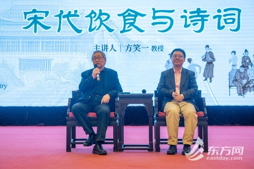 讲座临近尾声,方笑一教授与觉群诗社社长胡中行教授展开了一场精彩的对话交流。两位学者智慧碰撞,妙语频出,引得掌声笑声连连。他们一致认为,透过这些饮食诗词,我们能够更真切地感受宋代文人的生活情趣,这对于当下的创作与生活具有重要的启发意义。尽管世殊时异,部分食材和饮食习惯已不再适宜,但重要的是领会宋代文人热爱生活、顺应自然的风雅情怀,而非刻板模仿。