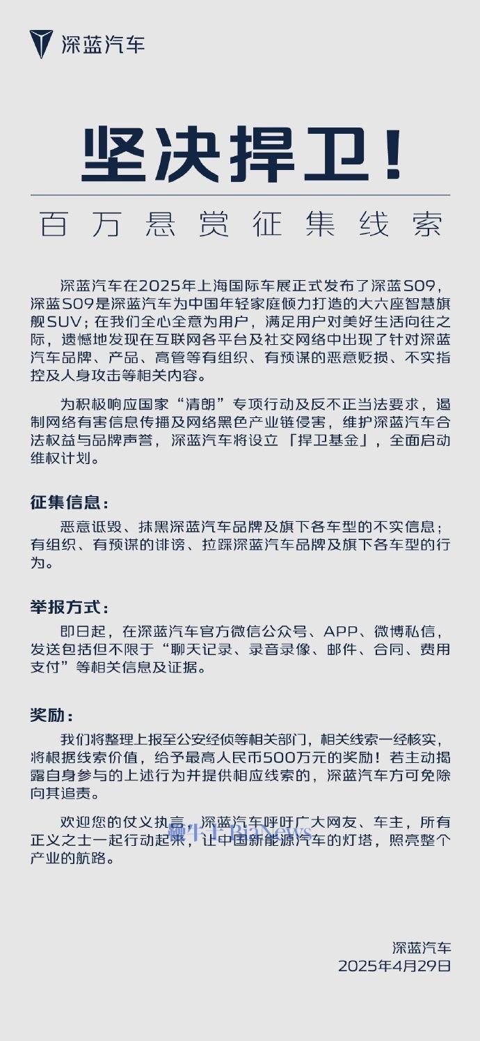 4月29日,深蓝汽车发文称,即日起征集侵权证据,一经查实必追到底,最高奖励500万。