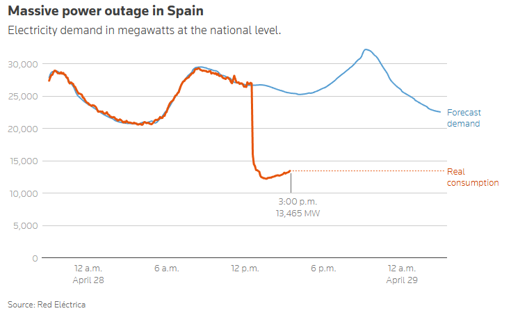 当地时间周一中午12:35左右,西班牙和葡萄牙大部分地区突然大面积停电,这次停电事件波及整个伊比利亚半岛,甚至影响到了法国部分地区。据西班牙电网运营商Red Eléctrica报告,在短短5秒钟内,约15吉瓦的发电能力突然消失,相当于当时全国电力需求的60%。