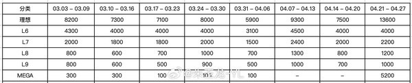 作为对比,在3月3日至4月6日,理想MEGA平均每周的销量在200辆左右,不到同时期理想L9的一半,理想L6的二十分之一。