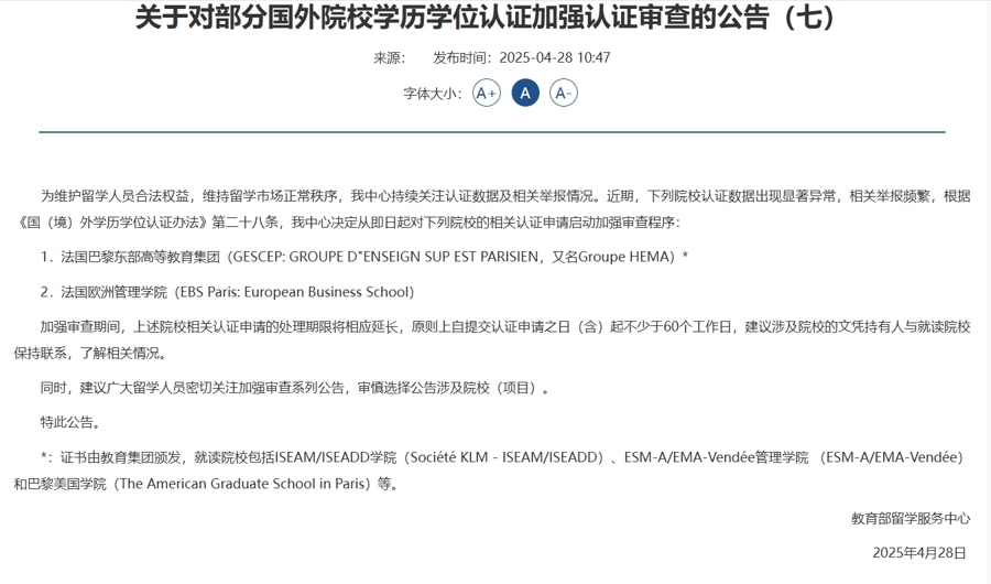 4月28日,教育部留学服务中心发布《关于对部分国外院校学历学位认证加强认证审查的公告(七)》(以下简称《公告》)。对多所认证数据出现显著异常的国外院校(项目)的相关认证申请启动加强审查程序。