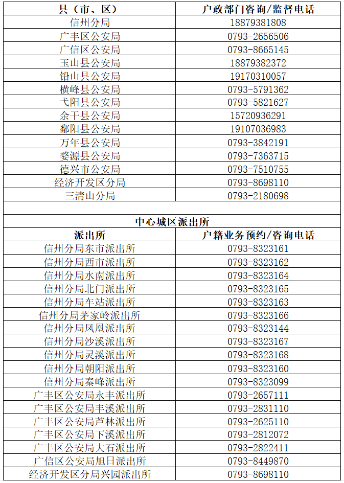中心城区及各县(市、区)户籍业务窗口咨询热线: