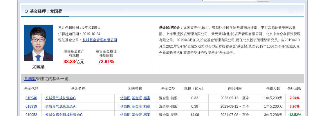 简历显示,尤国梁先生:硕士。曾就职于民生证券济南营业部、申万宏源证券济南营业部、上海宏流投资管理有限公司、天元天财(北京)资产管理有限公司、北京中金众鑫投资管理有限公司。2019年8月加入长城基金管理有限公司,历任北京投资管理部研究员。自2019年10月至2021年5月任“长城双动力混合型证券投资基金”基金经理,自2019年10月至今任“长城久嘉创新成长灵活配置混合型证券投资基金”基金经理。