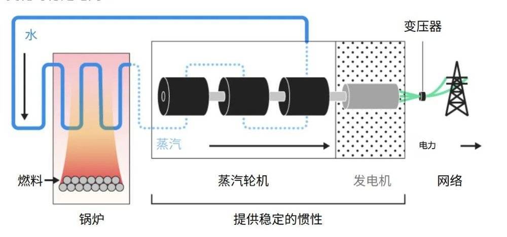 在化石燃料能源系统中,旋转涡轮机发挥着惯性支撑作用,并充当减震器,能够在能源供应或需求突发变化时,维持电网的稳定。