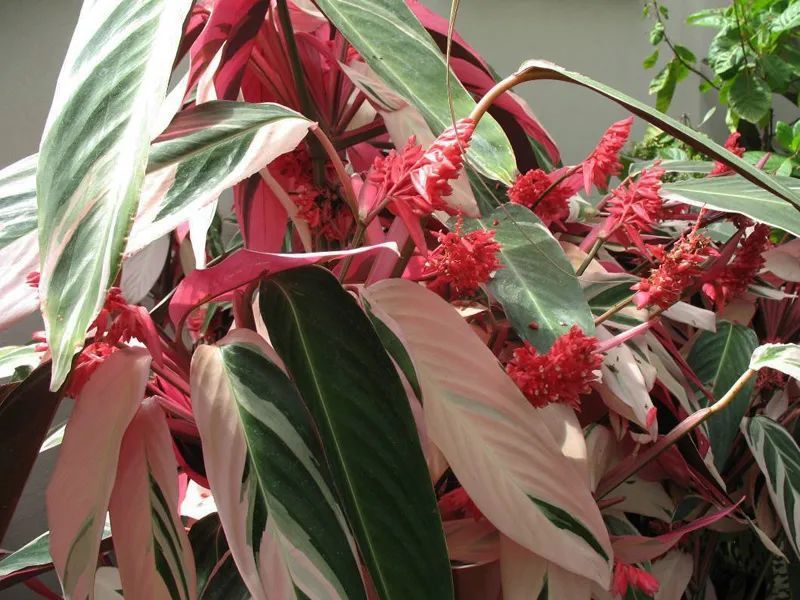 三色竹芋也是观赏竹芋家族的一员,它的叶片在白天的时候展开,夜晚的时候会折叠起来,这和很多观赏竹芋的生长习性是一样的,它在树荫下或在半阴的阳台上都可以生长良好,如果有适当光照,特别是在户外树荫下栽种,在每年的春季就可以开出红色的穗状花朵。